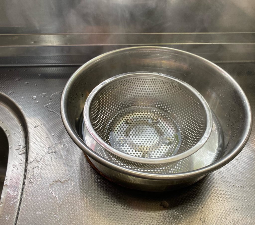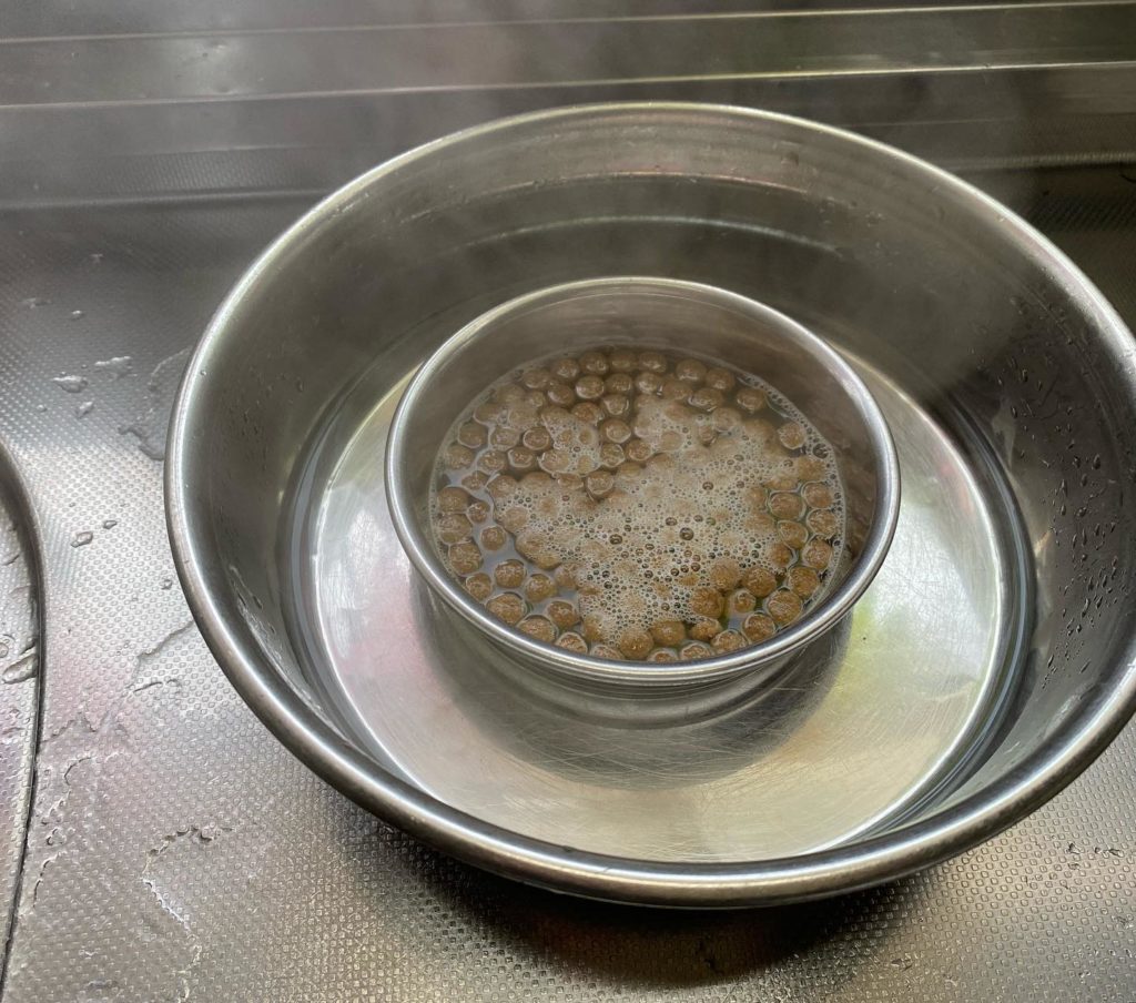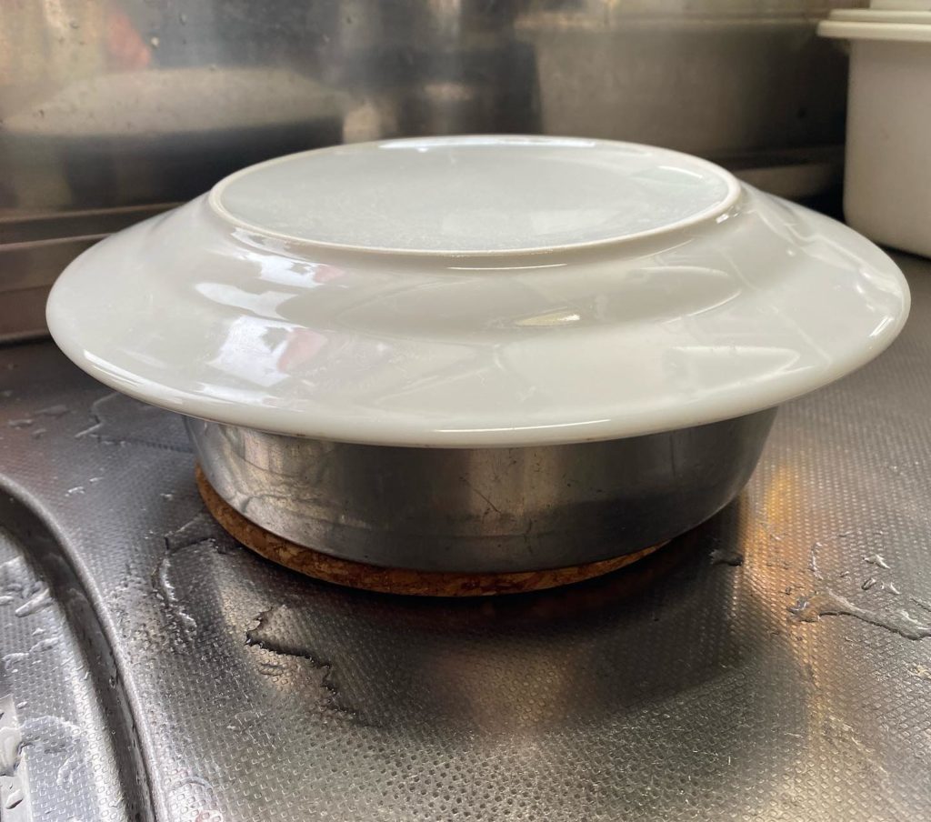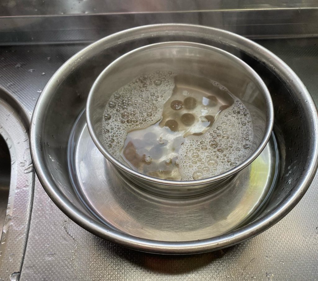 ステンレス器は、熱伝導が良いのと、煮沸ができるので、ふやかし用に使っています。今のステンレス器は、塗ってあるものが多いので、直接、口に入る器は、陶器を使っています^o^